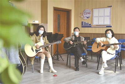 为改善老年人学习活动环境,我市高标准规划建设老年大学,现已建成并投入使用。老年大学设置了书法、舞蹈、吉他、越剧等30余项特色课程,满足老年人多元化精神文化需求。图为11月21日老年学员们在认真学习吉他。