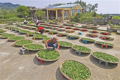 4月10日,在福建省泉州市泉港区涂岭镇,茶农们忙着晾晒新采摘的茶青。