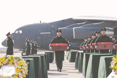 12时07分,一架空军运-20专机缓缓降落在沈阳桃仙国际机场。空军两架歼-20战斗机在专机进入中国领空后为专机伴飞护航,并在沈阳桃仙国际机场上空通场飞行,向志愿军烈士致以崇高敬意。专机降落后,沈阳桃仙国际机场以“过水门”最高礼仪迎接志愿军烈士回家。